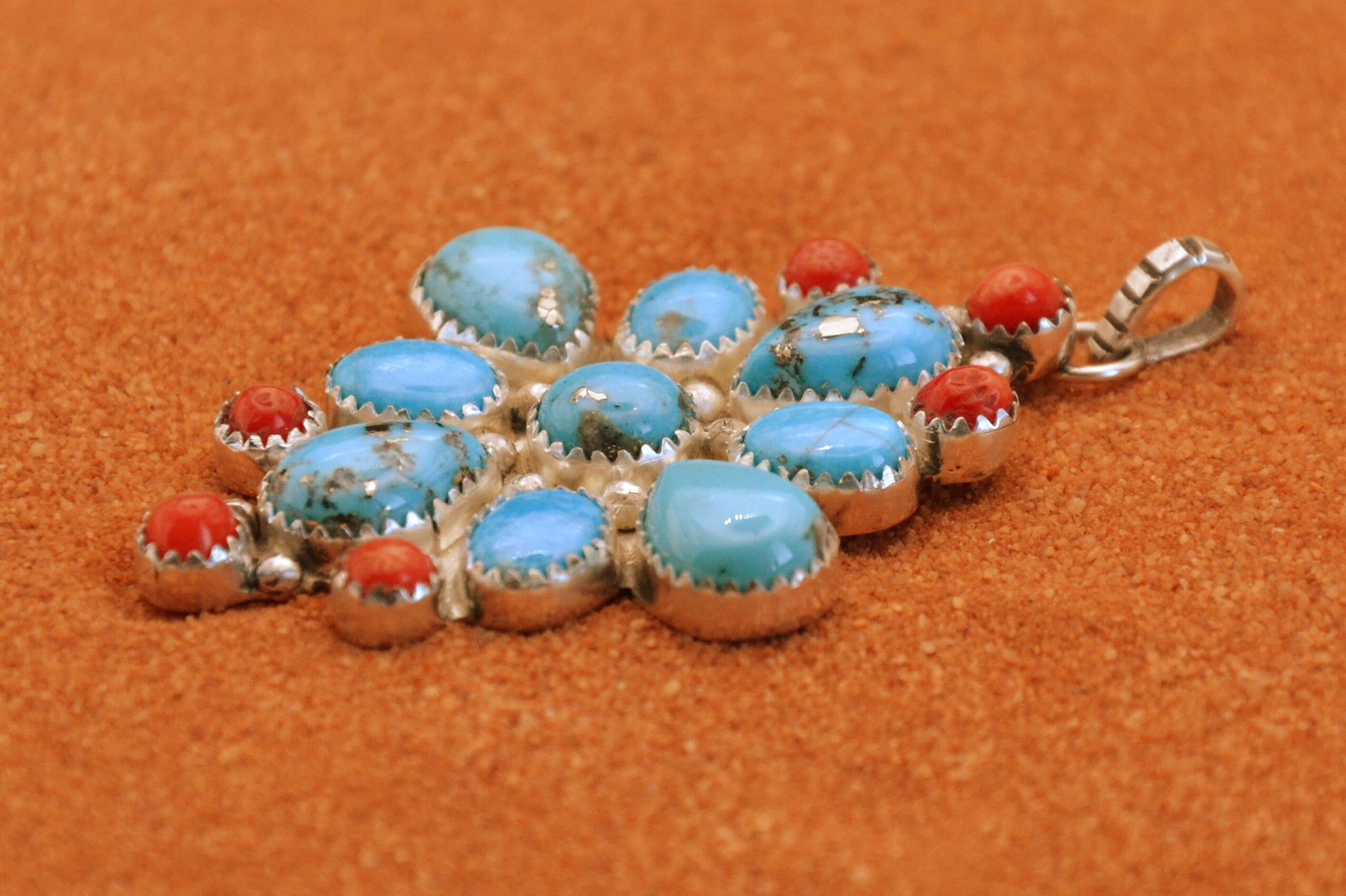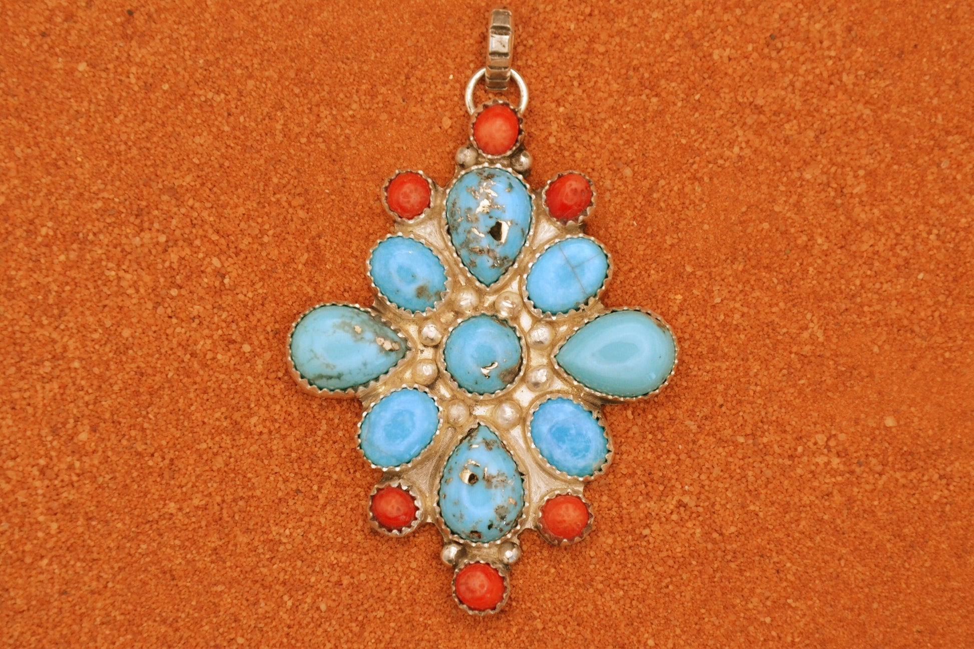 Pendentif femme-amerindien-style navajo-fleur-turquoise-corail-cadeau-artisanat-argent sterling